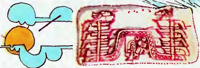 Три ромба в круге (на плоскости). Возможно, символ Земли. Исходя из других рисунков на полях, три круга, треугольник, трехгранная пирамида являются символическим изображением Земли (третья планета от Солнца). 12 углов у ромбов - количество лет оставшихся до появления звезды рядом с Землей (2012 + 12 = 2025 год.) Круги по окружности, вероятно, атмосфера нашей планеты. Справа звезда, соединенные перемычкой с Землей - захват ее атмосферы и гидросферы. Нечто подобное уже происходило около 1500 года до нашей эры.