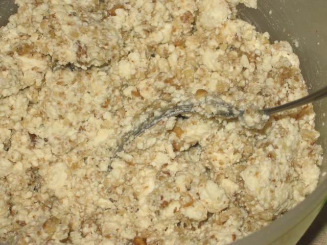 Тесто готово. Займёмся приготовлением начинки: в мягкий творог добавляем орехи, мёд.