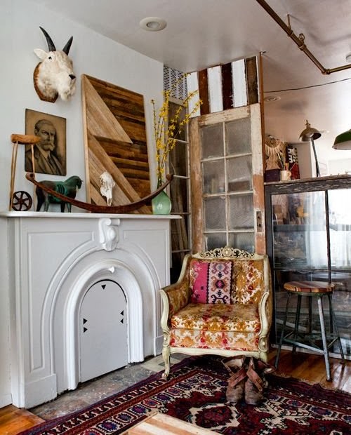 These old glass doors add both height and color to the wall.
