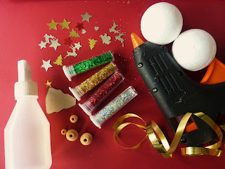 Первоначально прикрепляем ленточку к пенопластовому шарику.