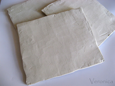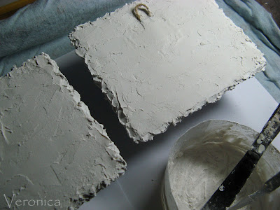Делаем гипсовую заготовку. Форма заполняется разведенным гипсом (гипс, вода, немного ПВА). Когда гипс схватится, но еще не высохнет, вынимаем из формы, подрезаем, если нужно, края. На поверхности специально оставляем небольшие неровности.