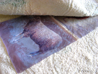 Наносим клей ПВА (у меня ИРКОМ) кусочком губки. При нанесении образовываются маленькие пузырьки, которые убираются легким прикосновением губки.