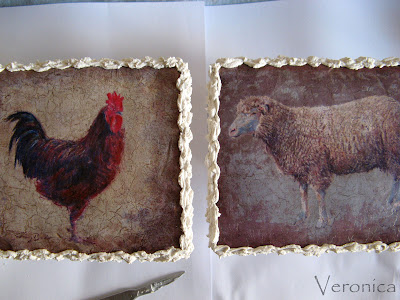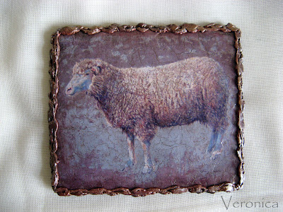 После высыхания кисточкой наносим глянцевый акриловый лак (ИРКОМ) и сразу сушим феном. Появляются трещины. Затираем их акрилом. Тонируем поверхность темной краской для состаривания и слегка тонируем золотом и серебром. Покрываем несколькими слоями акрилового лака.