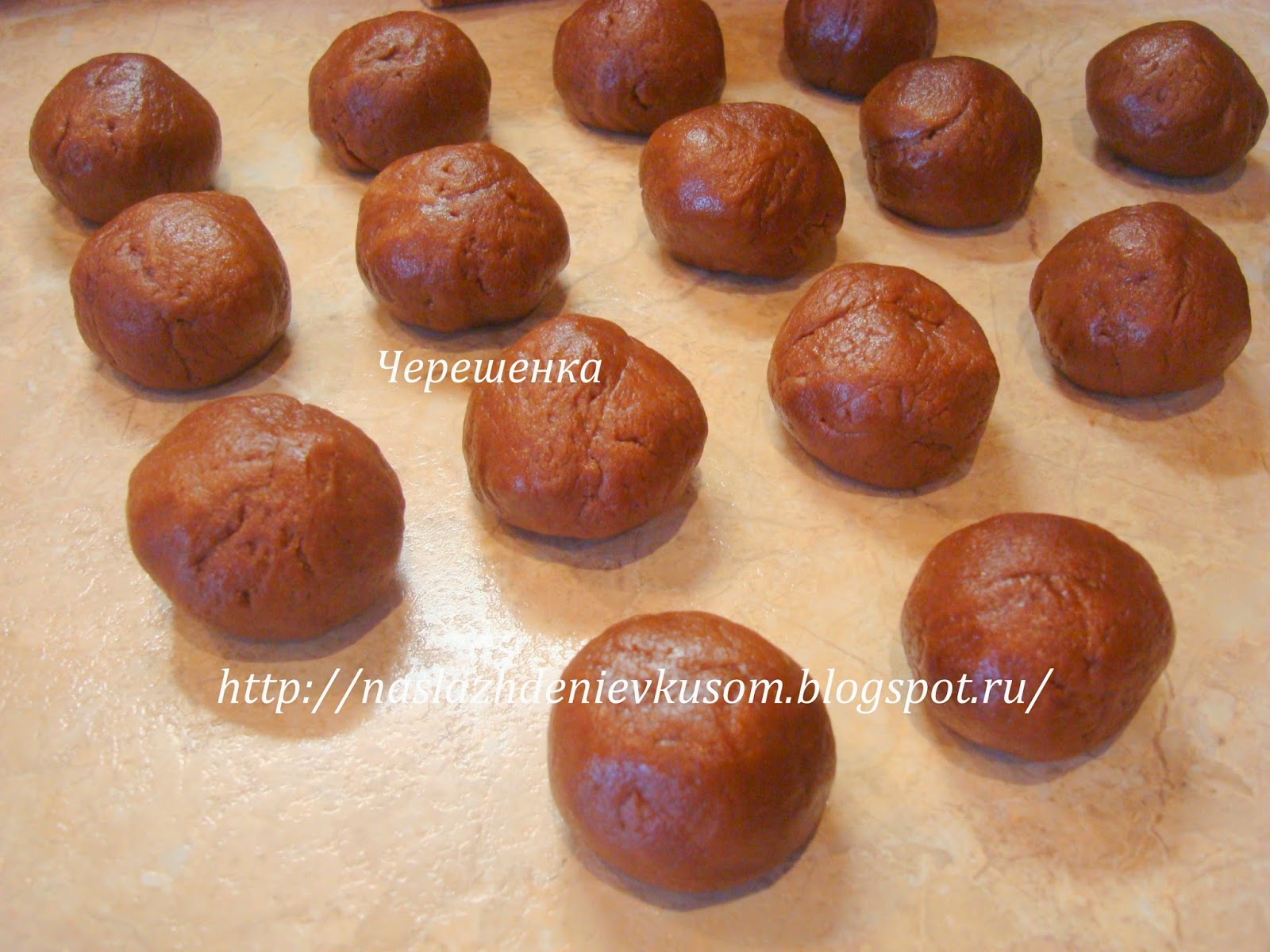 Включить духовку прогреваться на 180*С, а в это время застелить противень пергаментом, и скатать из теста шарики размером с перепелиное яйцо.