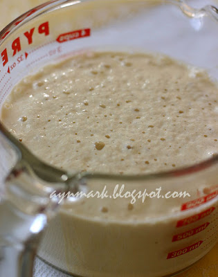 Смешать все ингредиенты в небольшой миске, накрыть плёнкой и оставить на 45-60 минут (опара увеличится почти вдвое).