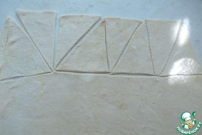 Просто отрезаем кусочек теста и раскатываем, с помощью ножа для пиццы разрезаем на треугольнички и ромбики. Если потоньше, то будет меньше слоев, если потолще, то больше слоев