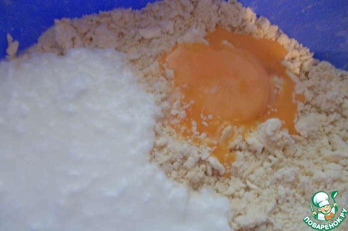 В муку отправляем маргарин, или сливочное масло, можно взять по 100 г каждого продукта. Превращаем все в крошку, это делается довольно быстро, руками.