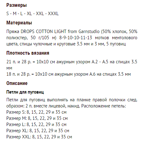 Романтичный женский жакет спицами с коротким рукавом реглан. По нижнему краю летнего выполнены рюши, сам же жакет украшен разнообразными ажурными узорами, схемы которых приведены в описании. Такую вещь можно смело носить как с юбкой, так и с брюками, ажурный жакет придаст Вашему образу женственность и утонченность. Летний жакет спицами с описанием и выкройкой для вязания подойдет для многих размеров, включая большие.