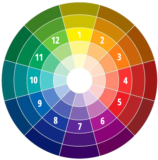 Пронумерованный от 1 до 10 ряд, который мы разбирали – это самые яркие цвета круга, чистые спектральные цвета, ничем не разбавленные. При движении к центру круга к чистому спектральному цвету добавляются капельки белого и красный смывается через розовые нежные оттенки до цвета лепестка розы. Аналогично синий смывается до нежного бледно-голубого, зеленый до светло-зеленого, желтый до бледно-желтого, оранжевый до нежных пудровых оттенков и т.д.