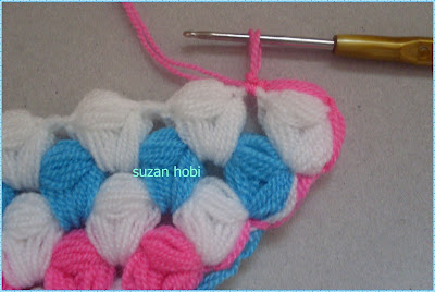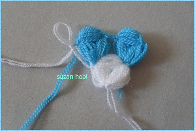 pembe ipime geçtim onu beyaz ilmeğin içinden geçirerek beyaz ipimi sıkıca çektim, pembe rengimle üç pıpırcık yaptım ,
