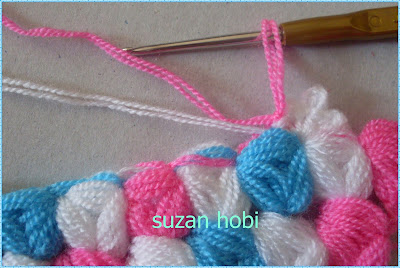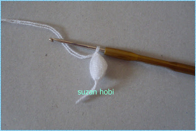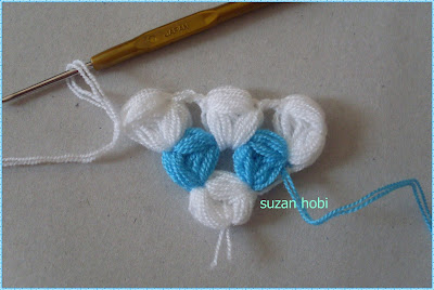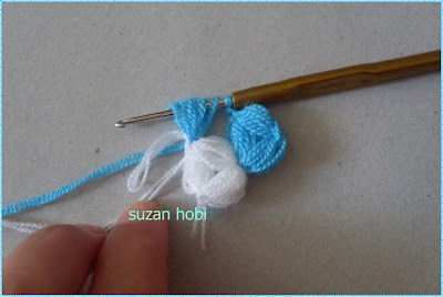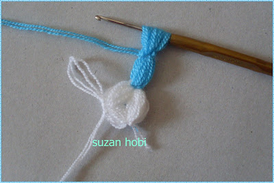 şimdi bir üst sıraya geçicez ,geçicez ama nasıl, bu kısımları çokkkk detaylı resimleyip anlatmaya çalıştım arkadaşlar:))tığımla beyaz ilmeğimi uzunca tabii çekerek alıyorum ve bu şekilde mavi ipimle olan ilmeğin içinden geçirerek mavi ipimi sıkıca çekiyorum,