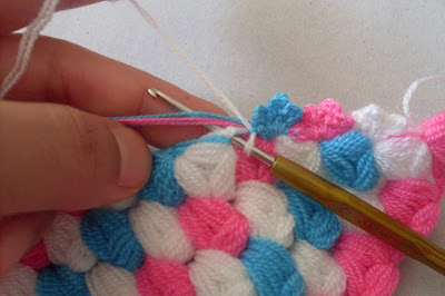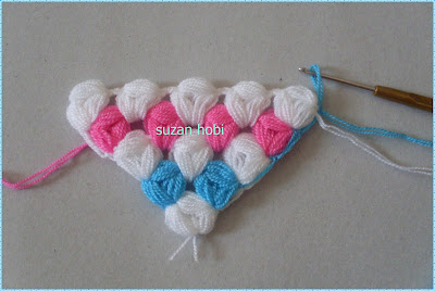 yine ok işaretiyle gösterdiğim yere tığımla girip mavi ipliği bu şekilde yukarıya