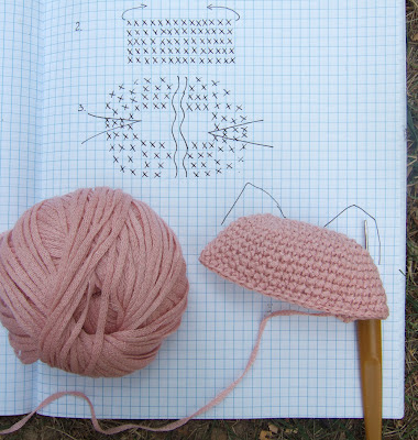Сделать ушки, глазки и носик лучше до начала филейной сетки. Для ушек набрала дугу, цепляясь за петли, убавления делала с одной стороны по 1 СБН, а со второй по 2 СБН.
