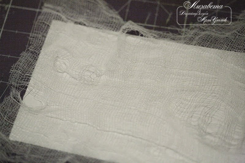 4. На правый угол заготовки накладываем тот кусок марли, через который мы брызгали спреем для создания фона. В художественном беспорядке оформляем складочки на марле и закрепляем их любым клеем. Я воспользовалась для этого Glossy Accent`s.