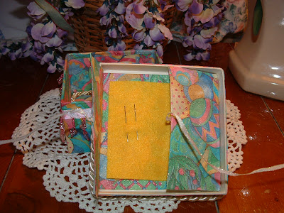 Приклейте нашу заготовку из картона к днищу крышки коробки, потом приклейте дополнительный кусок войлока для булавок и игл, внутрь крышки. Окончательно крышка должна выглядеть так: (ленты завязываем бантиком и наши иголки защищены крышкой)