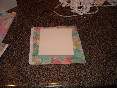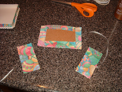 Возьмите ткань и оберните малый картон полностью в ткань, приложив между тканью и картоном кусочек ленты, тесьмы или шнурка. Повторите эту работу для второй части картона. (не жалейте клея!)