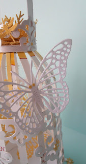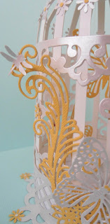 Клетка сделана из прочной белой ламинированной коробки от французского лосьона для тела, - я не стала прятать текст и рисунок, - и перламутрового белого и жёлтого кардстока Bazzill. Самые важные инструменты для сборки - это несколько видов клея, зубочистки и пинцет!