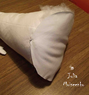выворачиваем все детали и набиваем синтепоном или синтепухом, голову и шею в конусе набиваем очень плотно, ручки послабже, особенно в местах пальчиков, конус набиваем пока что на 1\3