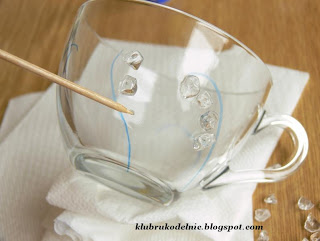 1. Обыкновенным водой смываемым маркером нарисуем по всей чашке пять веточек ландыша. На то место, куда будем клеить "цветки" капнем клей, на него прижмем бусинку и оставим высохнуть.