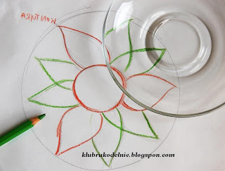 2. Пока бусинки будут сохнуть, мы украсим блюдечко.Блюдечко перевернем на кусок бумаги и обведем. Потом перевернем опять и обведем середину блюдечка. От этой середины нарисуем листья, три из них будут обведены золотым контуром, остальные не будут.