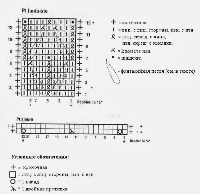 Набрать 47 (47/51) п. спицами №3,5, вязать 2 ряда платочной вязкой, затем продолжать фант, узором, начиная с 1 кром. и 7-й (7-Й/5-й) п. схемы.