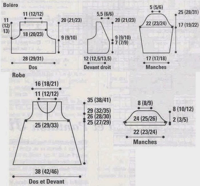 Пряжа Анни Блатт Луксор цвета незабудки 358 для платья 4 (4/5) мотка, для болеро 3 (3/4) мотка, для шапочки 1 моток. Спицы №3,5, вспом. спица, крючок №3, 5 пуговиц.