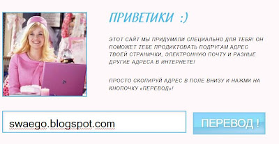 Есть такой забавный ресурс,в основном рассчитан на прекрасную половину человечества,но и нам,мужикам глянуть можно.Короче говоря,любой URL адрес можно превратить в забавное описание.Например адрес моего блога swaego.blogspot.com после их перевода будет выглядеть так: эс как доллар, дубльвэ как две галочки, a как русская, е, гэ как русская д, о кружочком, точечка