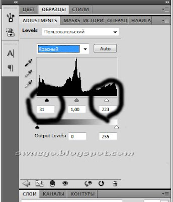 Выбираем Красный канал и тянем белый и чёрный ползунок ближе к середине.