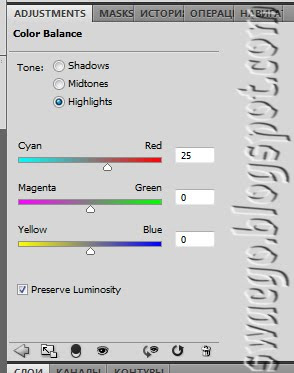 Теперь новый корректирующий слой,но на этот раз Цветовой Баланс.Выбираем Тени и ставим значения 0-25-0