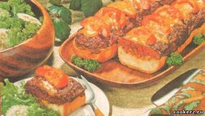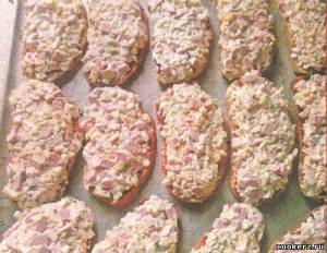 Ломтиками (чуть тоньше сантиметра) нарезаем батон и тонким слоем смазываем томатной пастой. Ложим сверху смесь: лук, колбасу, сыр и вареные яйца маленькими кубиками нарезаем, соединяем и добавляем чуть-чуть майонеза и перемешиваем. По желанию можем немного посолить. На сухой противень ложим бутерброды и ставим в разогретую духовку. Пока не подрумянятся запекаем.
