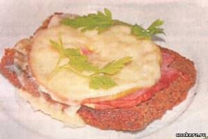 Горчицей смазываем хлеб, ложим кружок яблока без сердцевины, ломтик ветчины и снова кружок яблока на каждый ломтик хлеба. На полной мощности готовим в микроволновке минуты 2. После ложим по ломтику сыра на каждый бутерброд и снова в микроволновку минуты на 2 в режиме "гриль".