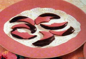 Обмакиваю одну сторону полумесяца в растопленный шоколад. Просушиваю на противне. Откладываю в сторону до тех пор, пока шоколад не застынет. При желании посыпаю сахарной пудрой или нарезанными лесными орехами.