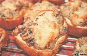2. Ломтиками нарезаем батон, сливочным маслом смазываем одну сторону. Смазанной стороной вниз ложим на сухой противень, грибную начинку распределяем сверху и посыпаем сыром, натертым на средней терке.