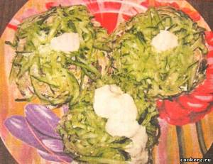 4. На крупной терке натераем огурцы и ложим на горки салата. Майонезом украшиваем. На несколько часов или на ночь готовый салат ставим в холодильник для пропитки.