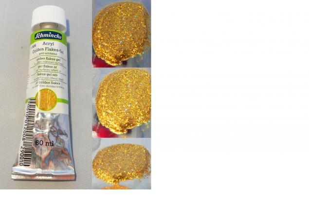 Я пользовалась еще одной пастой фирмы Schmincke - Acryl Golden Flakes-Gel № 50535. Это непрозрачная паста, имитирующая золотое покрытие. Но это не просто золото. Это золото, мерцающее разноцветными искрами. Очень красиво! Я постаралась как могла передать на фото это мерцание, но в реальности паста выглядит еще интереснее. Как и предыдущая хрустальная, она обладает такими же свойствами и при высыхании становится очень твердой. И без лака и краски, она тоже остается шероховатой, даже после разглаживания. С заливкой цветом нужно экспериментировать и смотреть результаты. Так, заливка оранжевым дала прекрасный оттенок, но заливка синим дала грязный синий цвет с желто-зелеными разводами. Думаю,лучше пробовать светлые краски.