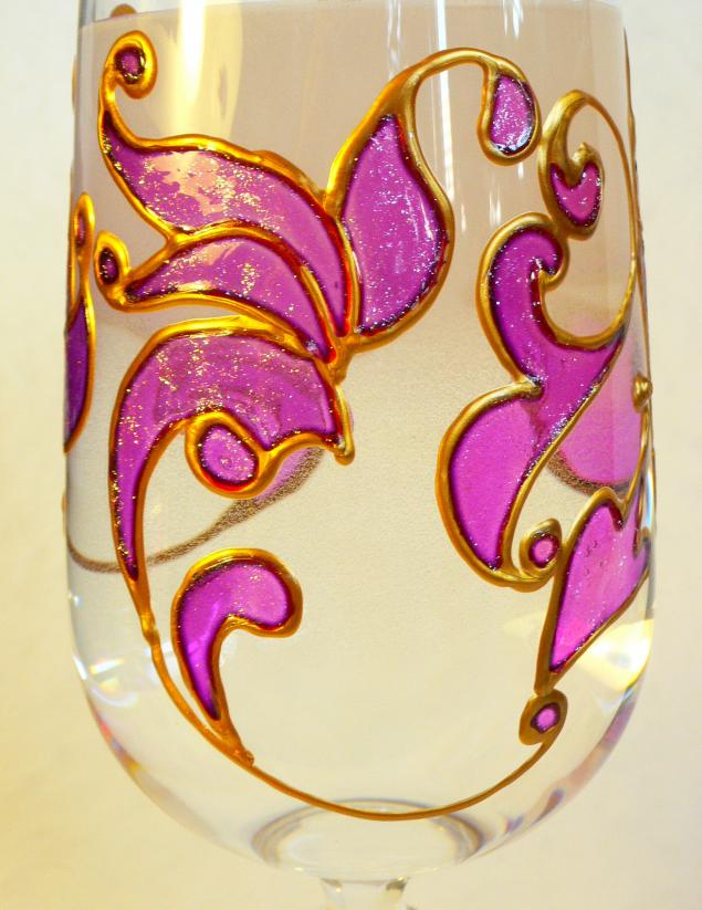 При применении этой серии обязательно нужно помнить о правиле - чем толще слой, тем дольше он сохнет. Но при многослойной росписи я советую даже тоненький слой этой пасты просушить не менее недели, прежде чем наносить следующий слой краски или пасты. Когда я использовала прозрачные цвета № 105 и № 113, то бокалы пришлось просушивать около двух недель, прежде чем паста полностью закрепилась и я смогла покрыть роспись лаком (да, да, у меня легкая форма паранойи и я стараюсь покрывать лаком любую краску и пасту, даже если заявлено, что она водостойкая :)) При использовании прозрачных и глухих паст этой серии, я заметила, что после высыхания прозрачные пасты более твердые, а глухие более упругие.