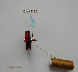 Опасность такого крепления в том, что оно может раскрутиться уже в готовом мишке. Избежать этого можно несколькими способами. Самый простой, и на мой взгляд надежный, выглядит так: после того как мы закрутили гайку, мы наматываем нитку на резьбу болта после гайки и пропитываем её клеем ПВА.