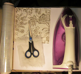 Шаг 3.Берем лист бумаги (формат на ваше усмотрение),кладем на бумагу "лист" пищевой пленки по размеру.На пленку кладем салфетку и накрываем ее марлей(это важное условие т. к. в противном случае к подошве утюга пристанет расплавившаяся пленка)