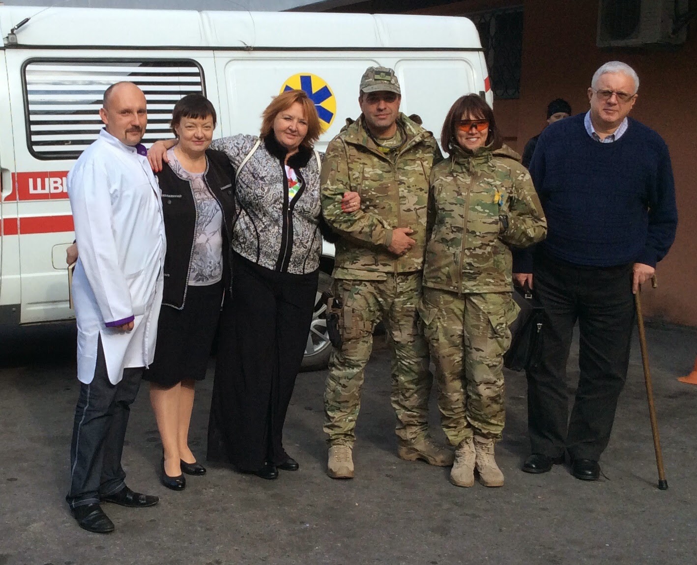 У больницы меня ждали уже прославленные Украиной волонтеры: Татьяна Рычкова, которая 40 дней назад проводила в последний путь своего погибшего на войне мужа, и Юрий Бирюков, на которого российские власти умудрились завести уголовное дело. Эти люди уже стали легендой волонтерского движения.