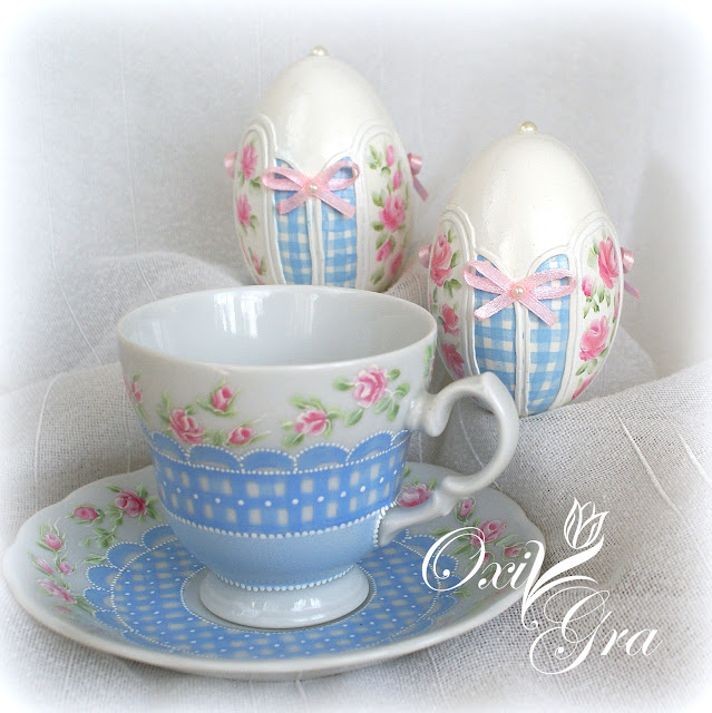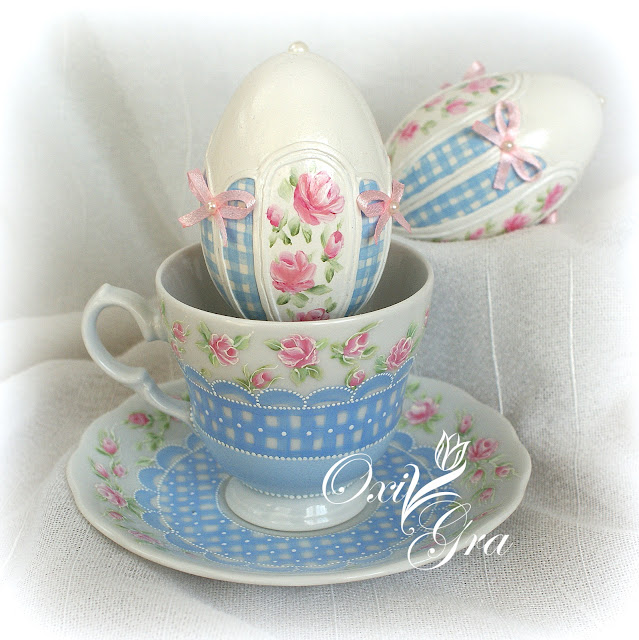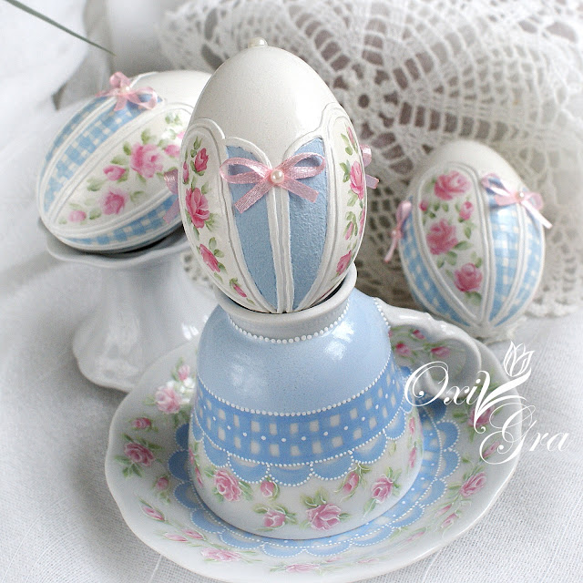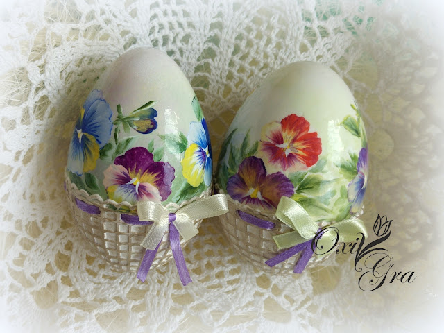 Chyba muszę zacząć od słów... Dawno, dawno temu.... a gwoli ścisłości jakieś 4 lub 5 lat temu zrobiłam swoje pierwsze pisanki w koszyczkach z bratkami. Wtedy techniką serwetkową. Bardzo ucieszyłam się kiedy dostałam zamówienie na "koszykowe" pisanki tylko tym razem ręcznie malowane. Oto one z każdej strony, kolorowe, radosne i wiosenne