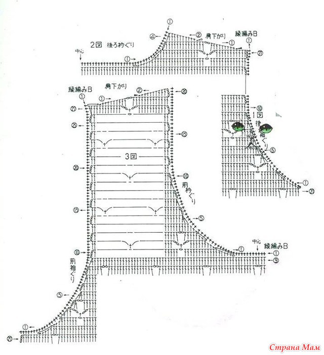 7 возд. петель по линии плеча к 22 в центре переда и снова плавно переходя к 7 возд. петлям уходящим на спинку. 3 и 4 ряд вяжите по схеме.