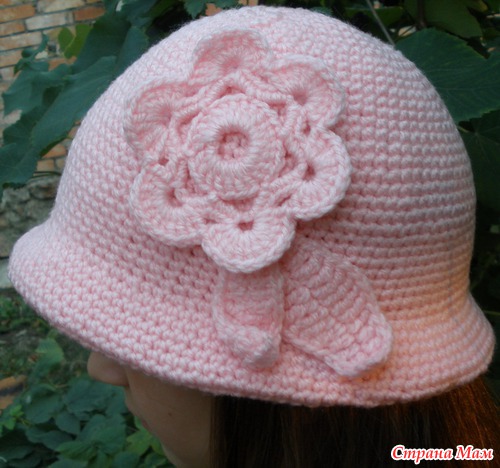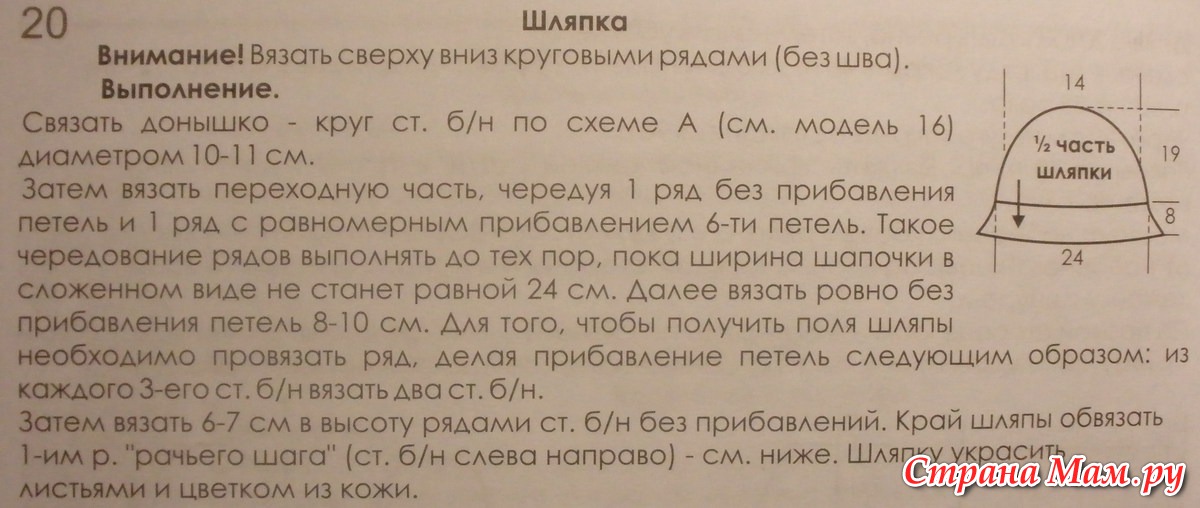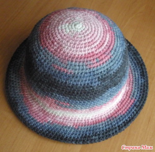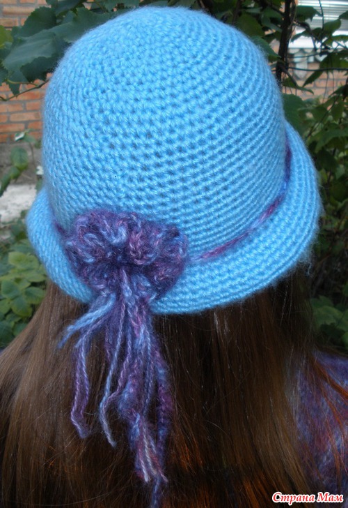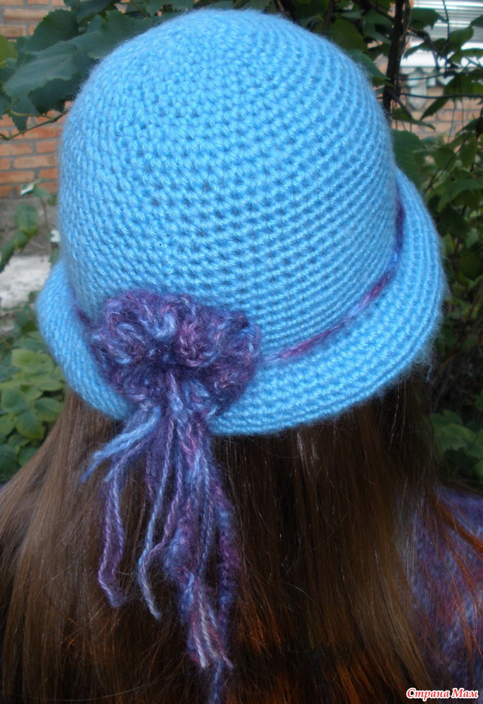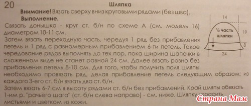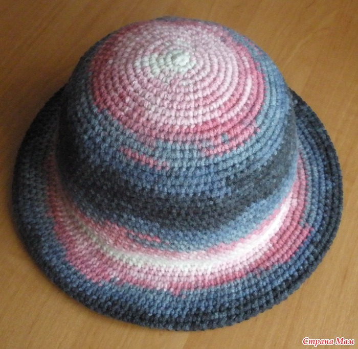Для полей делается расширение - из каждого третьего сбн вязать два сбн, потом 7-8см без изменений, затем убавить через два сбн два вместе, согнуть пополам и пришить к тулье с изнанки.