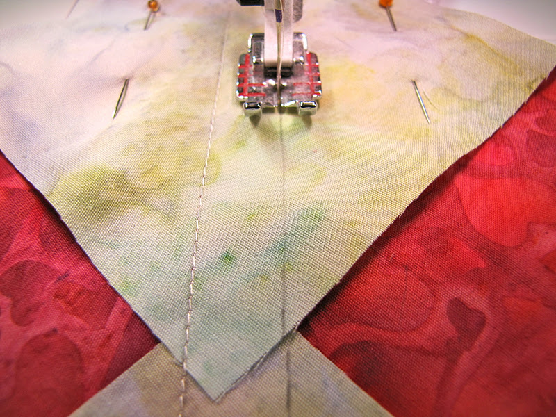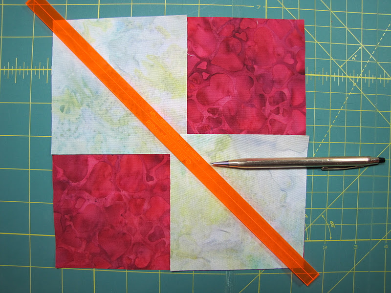 Take your ruler and cut it on the diagonal between the 2 stitched lines.