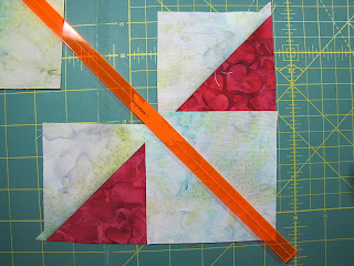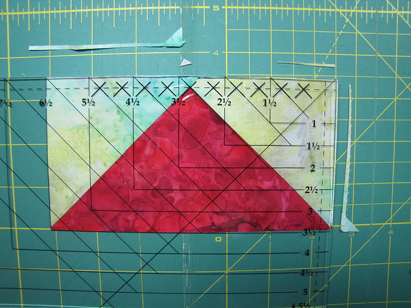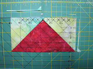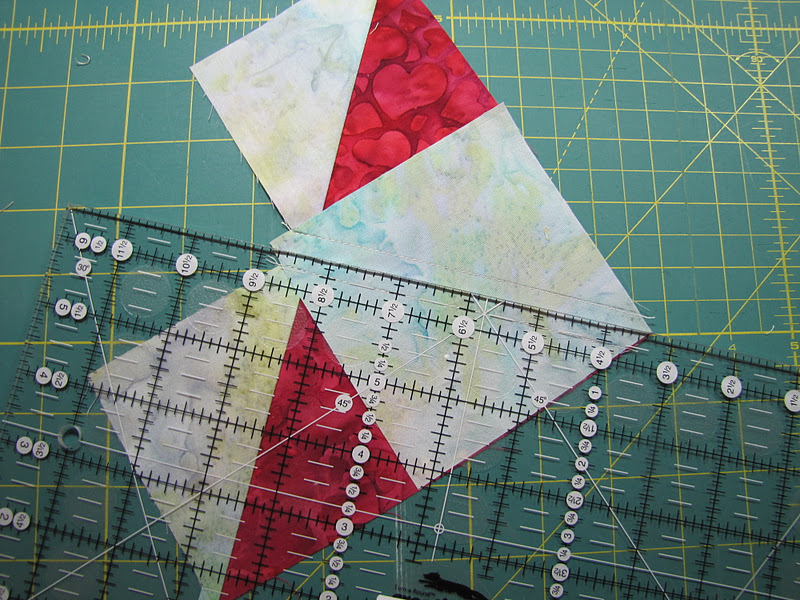Now turn the geese unit a complete 1/2 turn and then align the ruler with the correct lines and dimensions and trim away the right and the top sides