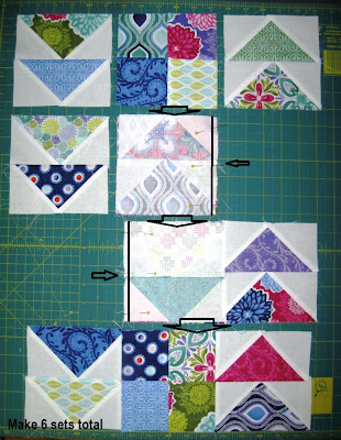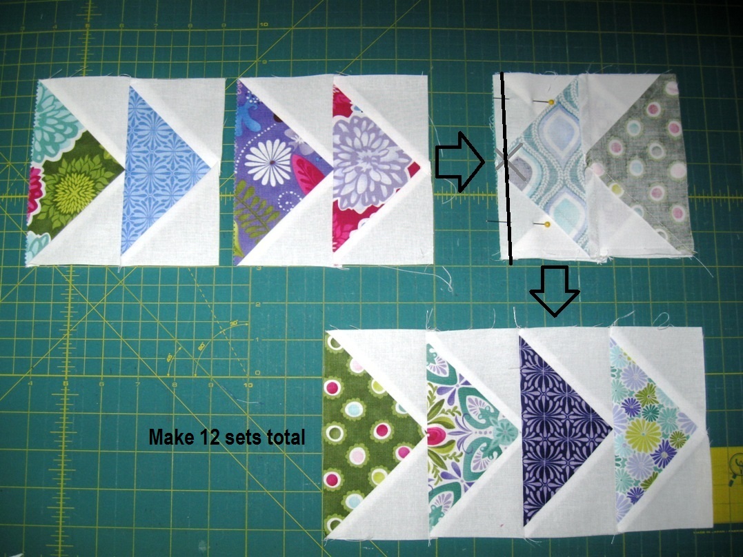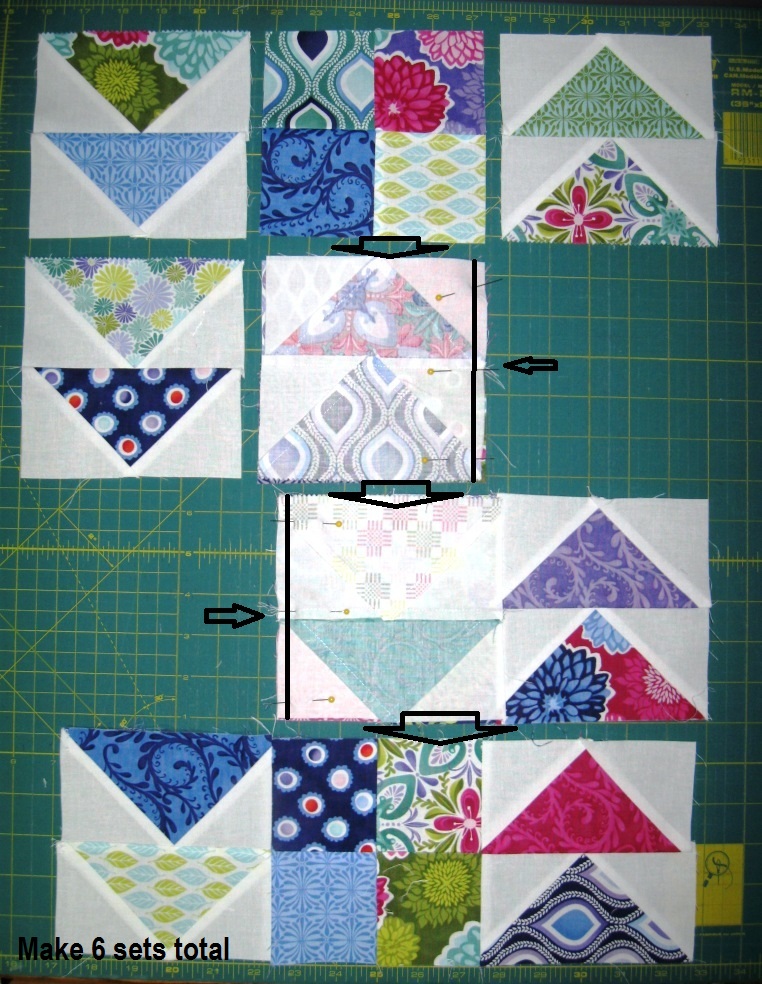 Now take the 6 four patches your just made and the remaining 12 sets of 2 geese and lay them out as follows making 6 sets. (Once again, really focus on the directional orientation.) Lay the right hand set of geese onto the 4 patch with right sides together. Take care to match the center seams. Chain stitch a 1/4" seam along all 6 sets. Clip your threads and press. Now repeat the same process with the left hand set of geese. You will now have 6 sets of center rows.