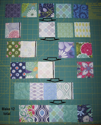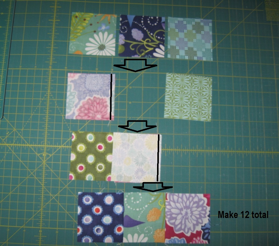 Now grab your pile of 3" print squares. You will be making 12 rows of 3. Start by taking 2 squares and with right sides together sew a 1/4" seam along any edge. (you won't need pins) Repeat this 12 times chain stitching to save time. Clip your threads between the 12 sets. Open your sets of 2. Now lay another 3" square with right sides together along the edge and chain stitch a 1/4" seam along all 12 sets to make 12 rows of 3. Clip your threads and press.