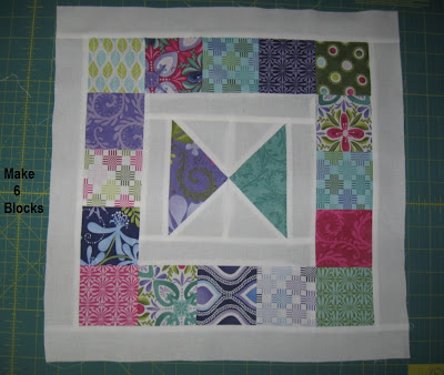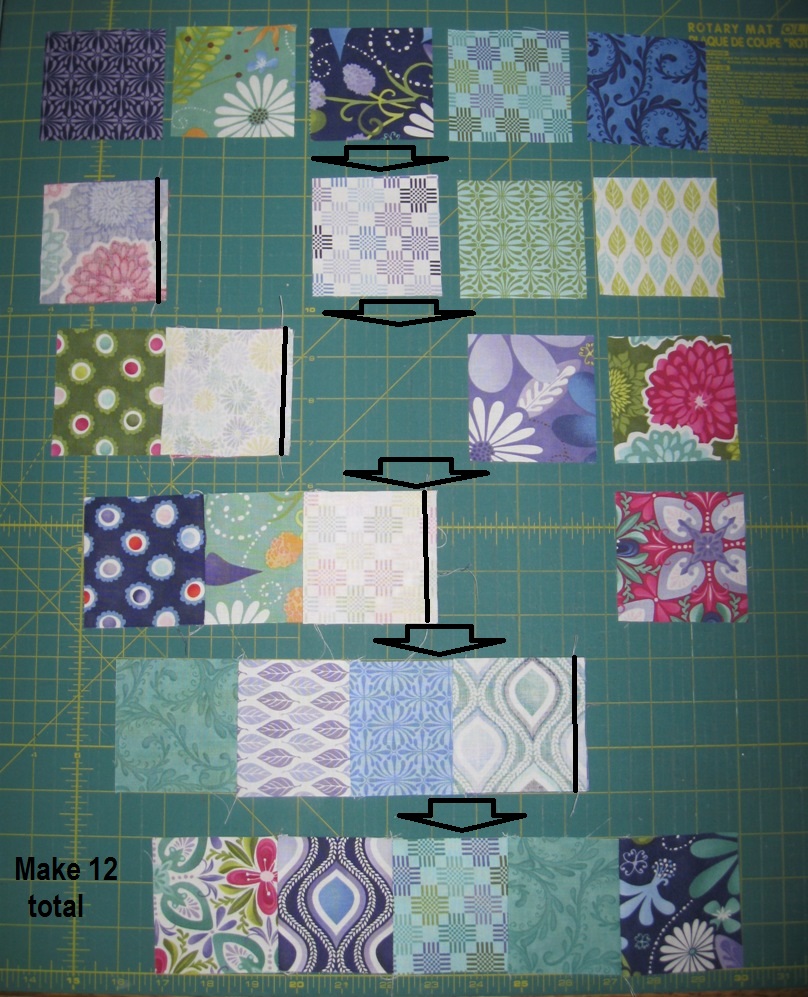 Now your block rows are complete and you are ready to sew your blocks together. Lay 6 blocks out as follows. I like to layout all 6 at first so I can play with the orientation of colors and get everything the way I like it before I sew.