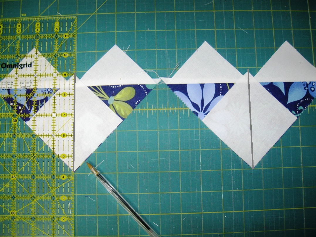 Now pin each piece far enough out that your foot will go by and then once again, stitch a 1/4" seam along both sides of the drawn diagonal line. (Remember to chain stitch to save time :)