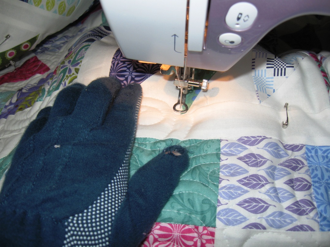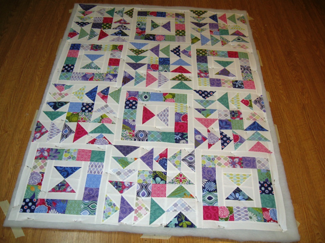 Make your quilt sandwich up. Taping the backing down to a hard surface will really help to keep out bunching in the back of your quilt. Baste your quilt sandwich. (The more pins the better :)