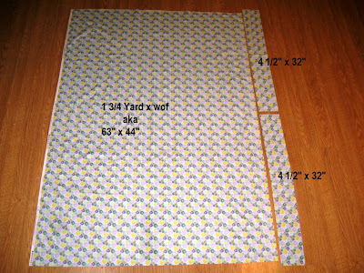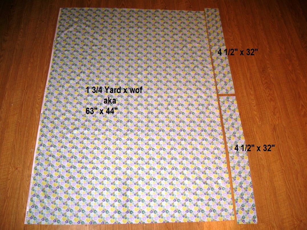 Take your 2 yards of backing and cut it into a 1 3/4" yard x WOF piece and then 2 4 1/2" x 32" pieces. Sew them together as the layout below.